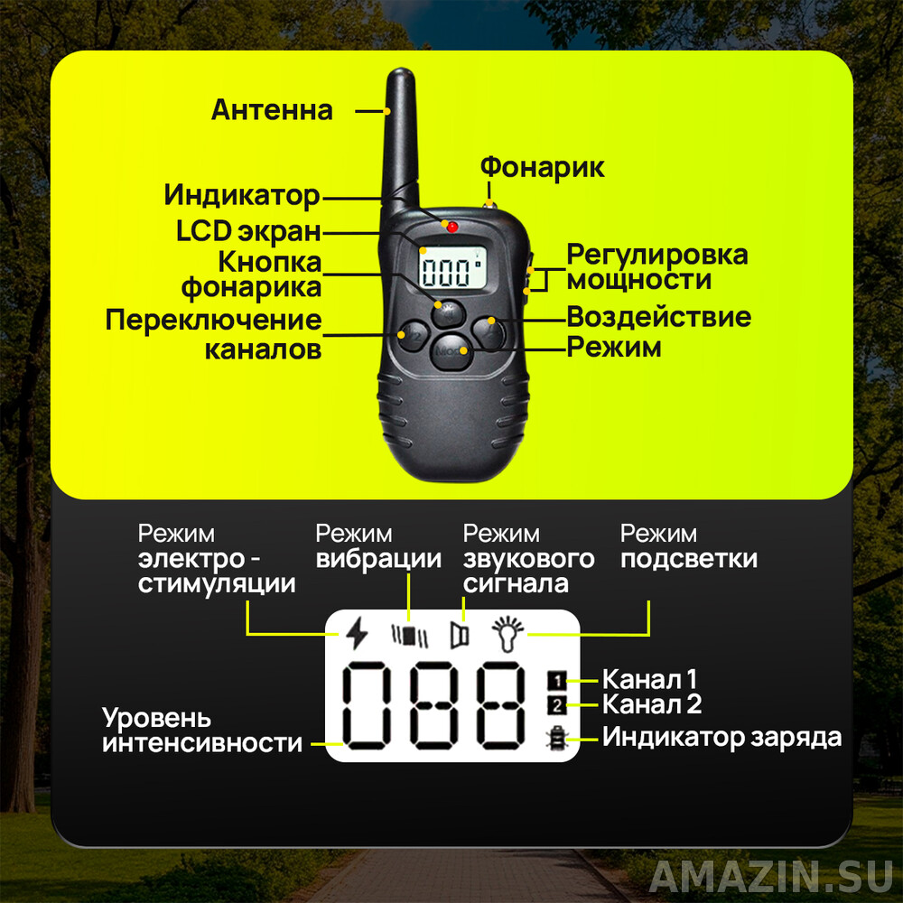 Диапазон действия PET998D до 300 метров. На LCD дисплее электронного ошейника отображаются режимы выбранного воздействия, сила воздействия (для электростимуляции и вибрации), канал (1 или 2 ресивер).
