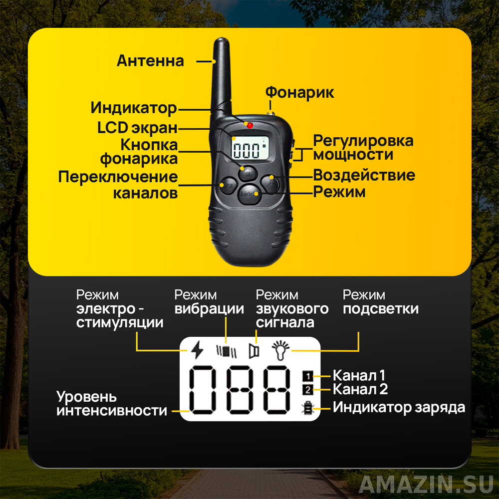 PET 998 DR (Axsel Fox) отлично подходит для дрессировки подходит для собак любой породы и весом от 5 кг до 80 кг. Электрошоковый обладает 3-мя видами воздействия: электростимуляция, вибрация, звук. Силу электростимуляции и вибрации можно регулировать с помощью кнопок < > на боковой части пульта от 0 до 100. Для переключения между функциями воздействия используется кнопка “Mode” на пульте управления, для подачи воздействия кнопка “Y”.