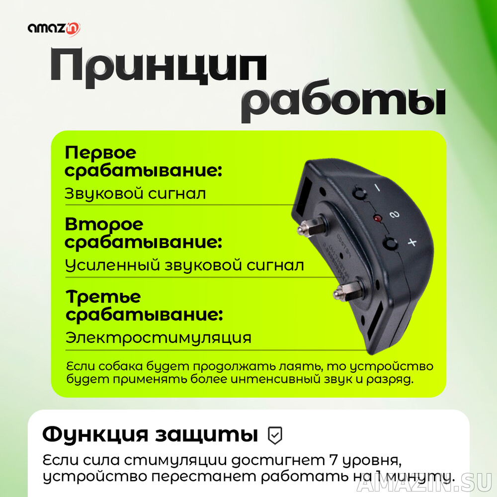На первом лае PET853 применяет короткий предупредительный звуковой сигнал. Если второй лай происходит в течение тридцати секунд, то будет звучать сигнал более интенсивного тона. С третьего лая, после звукового сигнала интенсивного тона, PET853 начнет воздействие электростатическим разрядом. Эта картина будет повторятся в течении 7 уровней прогрессивной коррекции, увеличивающейся по силе с каждым новым лаем. Если собака будет продолжает лаять, то PET853 будет применяться все более интенсивный звук и разряд, пока ваш питомец не прекратит лаять в течение тридцати секунд и более. После периода тишины длительностью более полминуты PET 853 будет автоматически возвращаться к первому уровню коррекции «только звуковое предупреждение». Для защиты собаки, если сила непрерывной стимуляции достигнет 7 уровня, PET853 перестанет работать на 1 минуту.