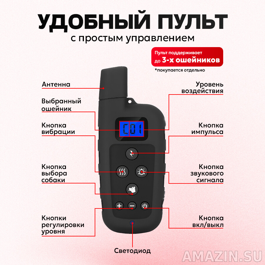 ПУ модели поддерживает 3 канала для дрессировки нескольких собак. Под каждое воздействие выделено по отдельной кнопке с командой, что очень удобно и легко запоминается. Для переключения на другую собаку можно использовать кнопку канала.