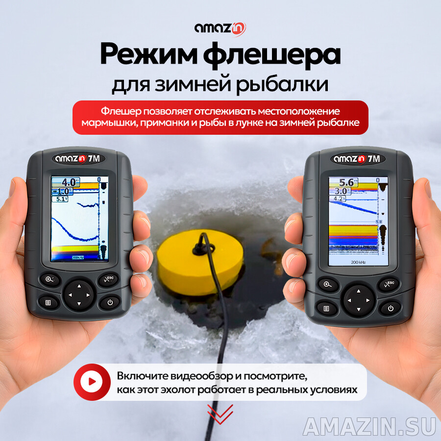 Эхолот Amazin FishFinder 7M – это проводной сонар для рыбалки с проводным датчиком и флэшером, который детально опишет вам подводную среду водоема: рельеф, глубину, температуру, а также наличие рыбы разных размеров. Двухлучевой Amazin FF7М, работающий на частоте 200 кГц / 83 кГц, можно использовать в любое время года – провод эхолота длиной 7,5 метра будет полезен не только с лодки летом, но и зимой на льду! Яркий и цветной дисплей 2,4" на 512 цветов с подсветкой покажет рыбаку подробное изображение рельефа и растительности дна, а также объектов в толще воды, что позволяет искать и находить рыбу на глубине от 0,6 до 73 метров под двумя углами сканирования в 20° и 60°!