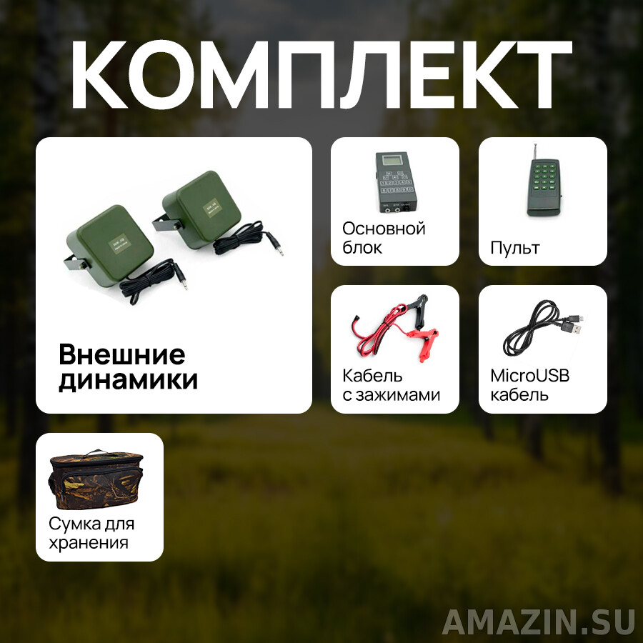 В комплекте 2 динамика, каждый из которых обладает мощностью 50 Вт и громкостью 150 дБ и позволяют приманивать дичь в диапазоне 300 метров, разнося по просторам окружающей местности четкие и натуральные голоса птиц и животных.