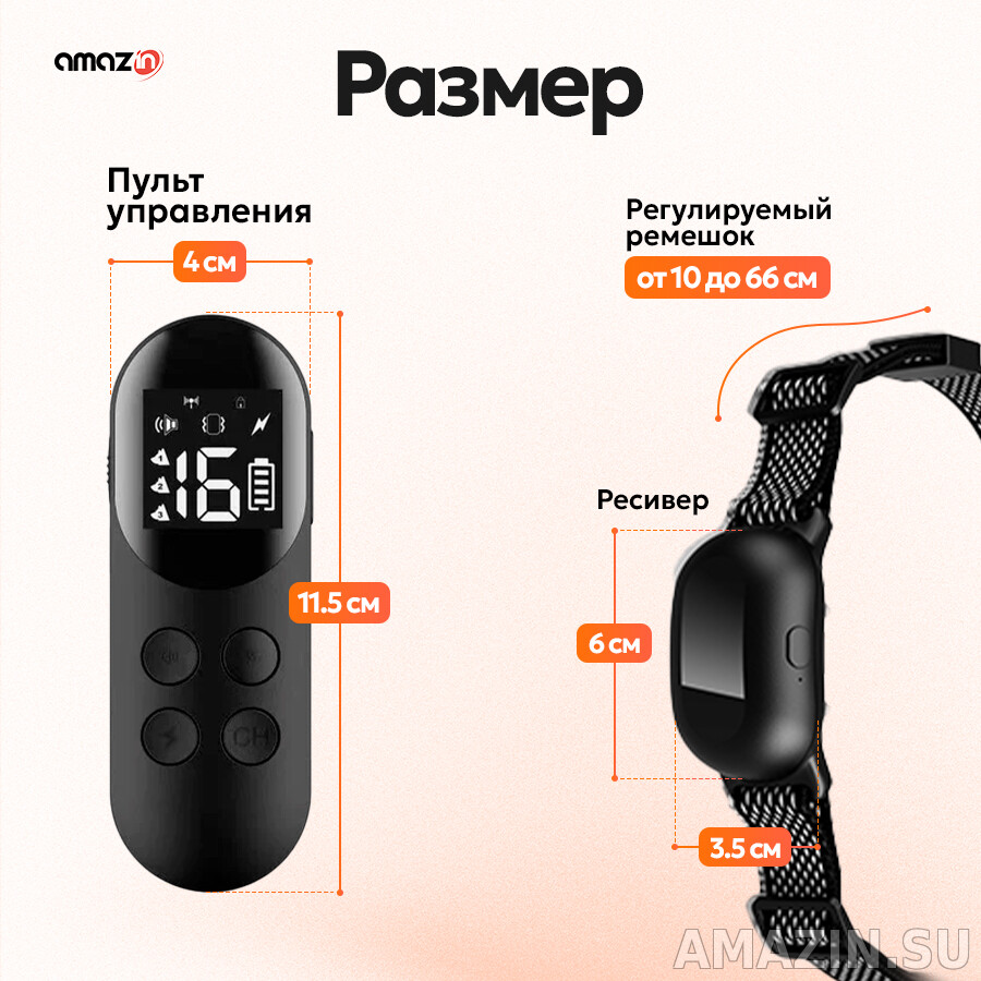 Регулируемый нейлоновый ошейник из ТПУ шириной в 2 см удобен для повседневного ношения вашим питомцем и подойдёт практически для всех типов собак разных размеров и пород с обхватом шеи в 10-66 см. Но если предлагаемые размеры ремешка Вас не устраивают, то Вы всегда можете использовать собственный ремешок, специально подобранный для вашего питомца! Если говорить про размеры непосредственно самого устройства, то пульт ДУ имеет ширину 4 см, высоту 11,5 см, толщину в 1,7 см и вес 47 грамма (включая аккумулятор). Приемник же имеет ширину 3,5 см, высоту 7 см, толщину в 2,5 см и вес его составляет всего 40 грамм. Кстати, нельзя не отметить очень приятный на ощупь корпус как у пульта, так и у ресивера, а также их оригинальный и стильный дизайн, которому позавидует любой окружающий!