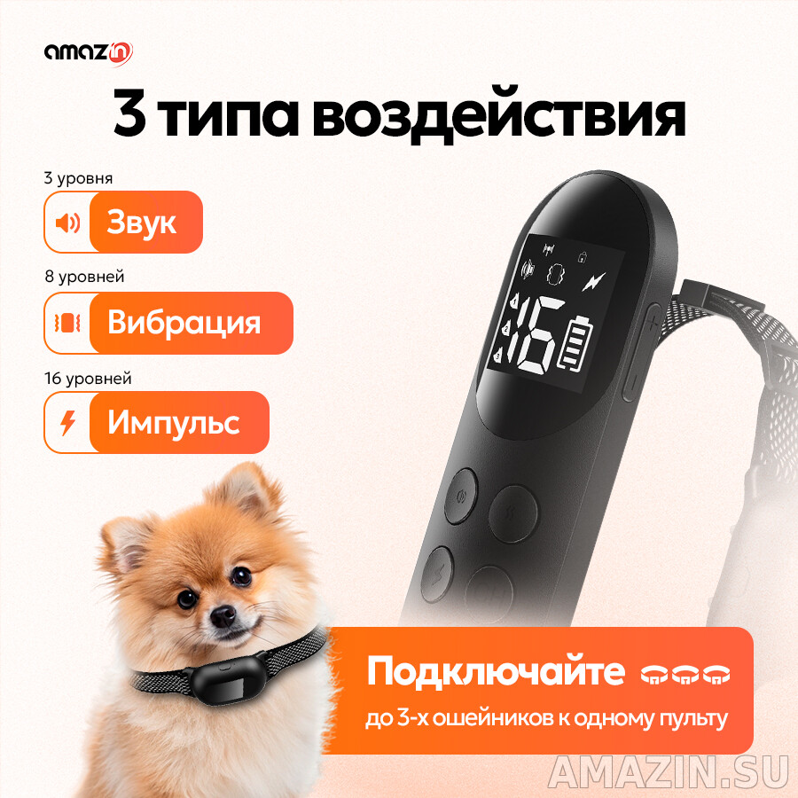 Amazin T200 - водонепроницаемый тренировочный ошейник с радиусом действия 300 м для собак всех пород от 2 до 50 кг. Ошейник имеет 3 вида коррекции: звук, вибрация и электростатический импульс, при этом уровень и степень воздействия функций удобно регулируется с пульта. Приобретая еще два ошейника, вы сможете одновременно обучать до 3-х собак благодаря многоканальной функции передачи сигнала. Эргономичный пульт со светодиодным дисплеем и стильным дизайном, который удобно ляжет в вашей руке, предлагает предельно простое управление - для каждой функции отведена своя специальная кнопка. Помимо этого пульт оснащен замком безопасности, предотвращающим случайное нажатие кнопки, например, в кармане. В упаковке T200 вы найдете короткие и длинные электроды с идущими в комплекте резиновыми колпачками, что сделает ношение ошейника максимально комфортным и безопасным для таких пород, у которых нет шерсти, для более чувствительных собак или склонных к кожным высыпаниям. После 2 часов зарядки магнитным кабелем ошейник Amazin T200 проработает до 30 дней в режиме ожидания!