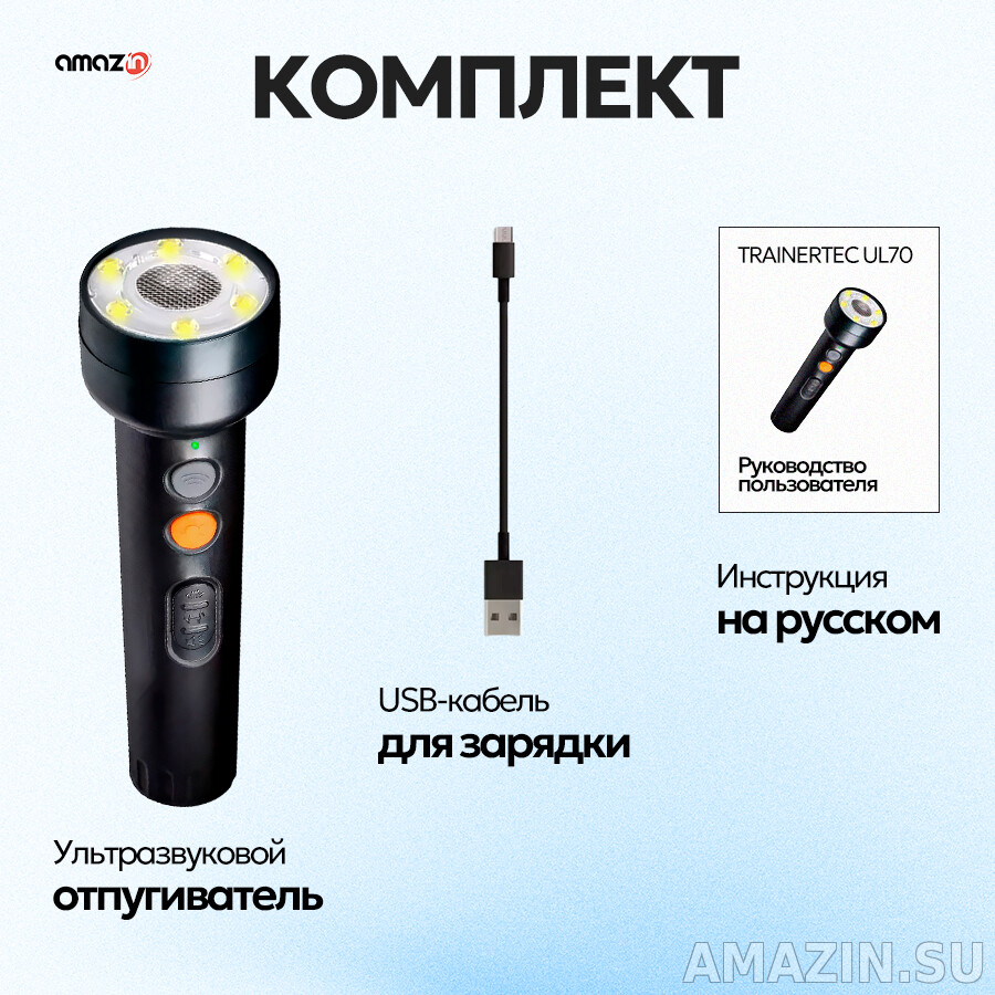Ультразвуковой отпугиватель собак со встроенным фонариком Trainertec UL70 - это отличный вариант для прогулок, если вы боитесь собак. Больше вас не будут доставать бродячие псы, ведь у вас в руках будет мощное оружие против них - ультразвук, который не слышен для человеческого уха, но его отлично слыша собаки. Ультразвук неприятен для слуха собак, поэтому они сделают всё, чтобы избежать его. Поэтому, если вы увидели приближающуюся к вам или вашему ребенку собаку, просто направьте ультразвуковой фонарик на не, и собака тут же убежит обратно. Безопасность превыше всего!