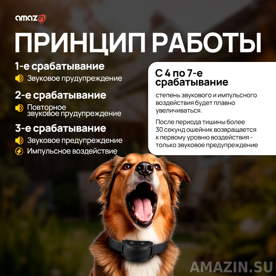 Владельцы собак уже не первый раз отмечают, что сам факт ошейника антилай на шее питомца действует как сдерживающий фактор. При первом лае, если он будет громче установленного порога чувствительности, ошейник антилай издаст предупредительный звуковой сигнал. Если собака продолжит лаять или издаст второй громкий звук, то PD 258S издаст более длительное и интенсивное звуковое предупреждение. Если лай повторится снова в течение 30 секунд, антилай произведет первое электрическое воздействие на минимальной мощности. С каждым разом уровень силы тока будет возрастать до предельного 7. После максимального воздействия, микропроцессор ошейника блокирует все команды и прибор уходят в спящий режим на 1 минуту. После того как период блокировки пройдет, антилай PD 258S вернется к первому этапу.