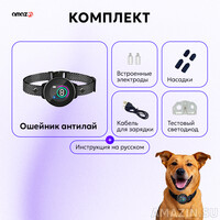 Ремешок ошейника выполнен из нейлона, размеры регулируются с помощью клипсы. За питание устройства отвечает аккумулятор, зарядить который можно с помощью USB.