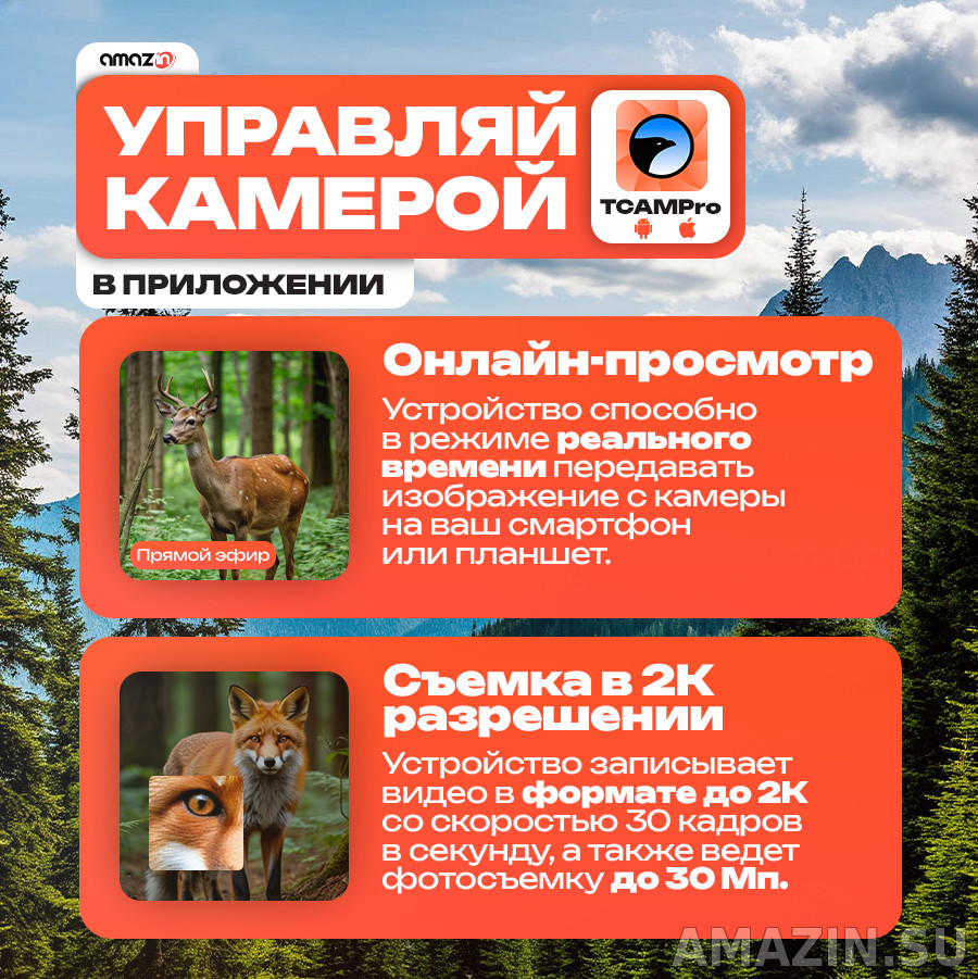 - Мобильное приложение. Фотоловушка поддерживает работу с мобильным приложением Suntekcam для Android и iOS. C его помощью вы сможете настроить сохранение видео и фото в облачное хранилище. Кроме того, вы сможете просматривать изображение с камеры в режиме реального времени, а также сохранять видео и фото в память смартфона.