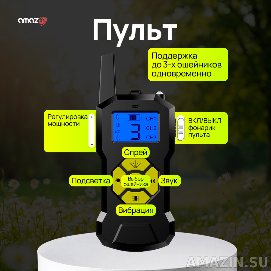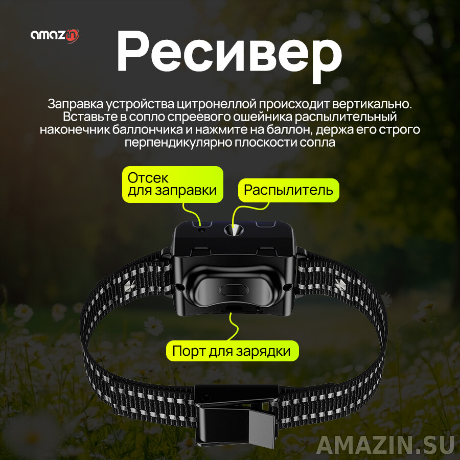Представляем революционное решение для дрессировки вашего питомца – электронный ошейник Amazin Сталкер Т500, у него нет электродов и его удобно носить. Это делает спреевый ошейник очень приятный для ношения и подходит для пород с повышенной чувствительностью. Основное воздействие - выброс спрея с шипящим звуком который не приятен собакам. Состав спрея безвреден, натурален, состоит из вытяжки лимона. С впечатляющей дальностью действия до 800 метров вы получаете беспрецедентный контроль над собакой в любых условиях – будь то просторный парк, лесная прогулка или тренировочная площадка. Уникальная трехкомпонентная система коррекции (звуковой сигнал, вибрация и инновационный спрей-модуль) позволяет подобрать идеальный метод воздействия для вашего питомца.
