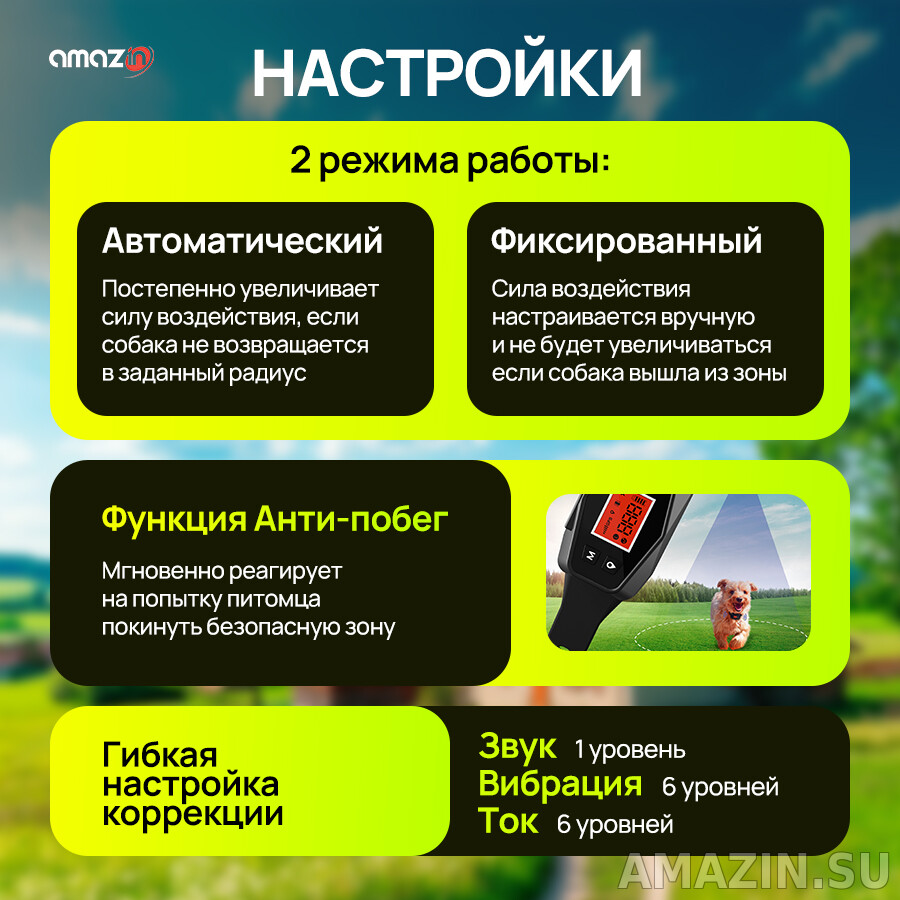 Функция анти-побега мгновенно реагирует на попытку питомца покинуть безопасную зону. Вы можете выбрать наиболее подходящий режим коррекции поведения: от мягкого предупреждения (звук+вибрация) до более ощутимого воздействия (звук+вибрация+ток). Особого внимания заслуживает двухрежимная система мощности: автоматический прогрессивный режим постепенно увеличивает силу воздействия, а фиксированный позволяет вручную установить оптимальный уровень коррекции. Система поражает своей гибкостью настроек – вы можете плавно регулировать ширину контрольной зоны от 33 до 999 метров в идеальных условиях открытой местности.