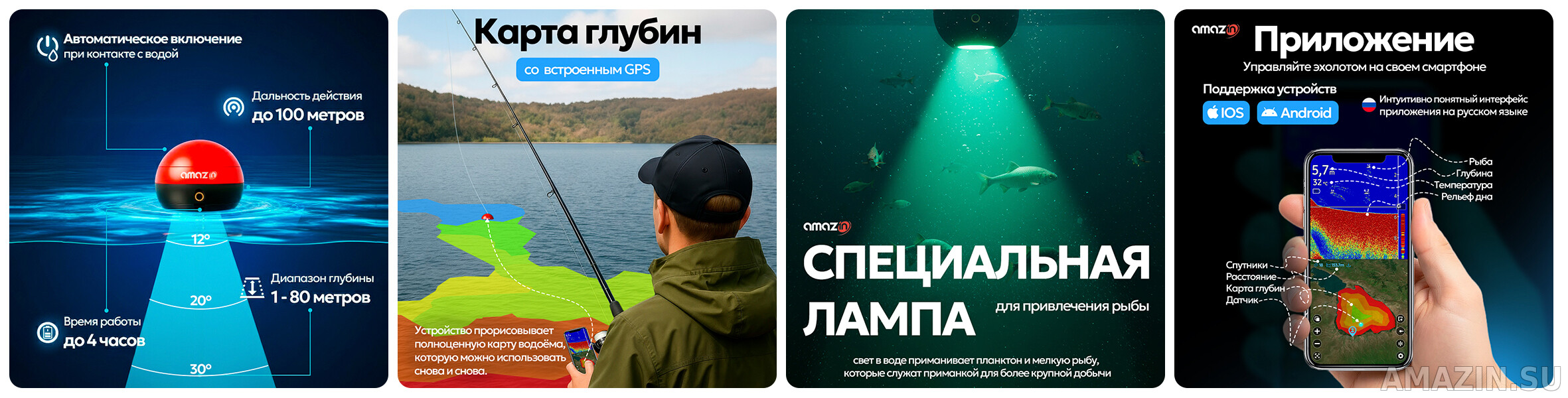 Эхолот для рыбалки на телефон показывает детальную карту глубин, отмечает ваши маршруты и создаёт собственную GPS-карту водоёма. Это особенно ценно на незнакомых местах: всего несколько забросов – и у вас уже есть представление о рельефе дна и глубинах, где прячется улов. При этом устройство остаётся простым в использовании: подключение по WiFi к Android или iOS, удобное приложения для эхолота и инструкция на русском языке. Эхолот работает на расстоянии до 100 метров от смартфона и сканирует глубину до 80 метров, а регулировка частоты, угла луча и чувствительности позволяет настроить его под любые условия. Встроенные оповещения о рыбе и сигнализация глубины помогают не упустить момент клёва, а режим подавления шумов обеспечивает чёткое изображение даже в самых сложных ситуациях. Для рыбалки предусмотрена специальная лампа-приманка: свет привлекает планктон, мелочь и хищников, превращая ваш эхолот шар для рыбалки с берега в настоящий магнит для рыбы. Лёгкий и удобный круглый эхолот для рыбалки работает до четырёх часов от встроенного аккумулятора и даёт всё, что нужно для успешной рыбалки: от профессионального режима с дугами до собственной карты глубин в смартфоне. С этим сонар CHIRP устройством вы всегда будете знать, где клюёт, и сможете строить свою личную карту уловистых мест. А чтобы вы были уверены в покупке – на устройство действует официальная гарантия 1 год. Именно поэтому Amazin SONAR CHIRP PRO+ по праву можно назвать лучший беспроводной эхолот в своей категории.