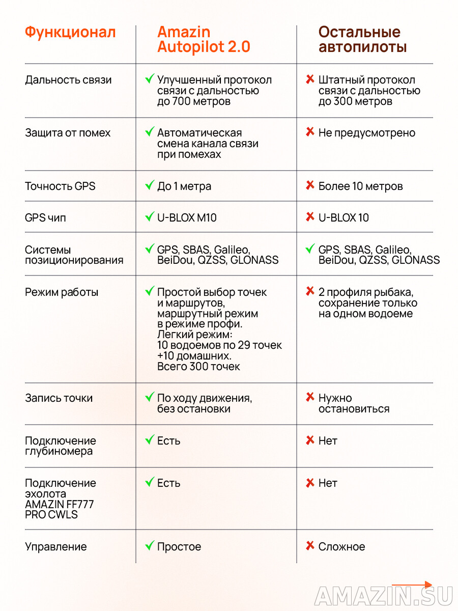 Дальность управления не вызывает беспокойства — автопилот обладает самой стабильной связью на рынке с рабочей дистанцией более 500 метров. Прошивка Amazin Autopilot 2.0 с усовершенствованным протоколом связи позволяет работать до 700 метров в идеальных условиях, обеспечивая точность завоза до 1 метра даже спустя длительное время. Это значительно превышает возможности стандартных автопилотов, благодаря автоматическому переключению каналов связи.
