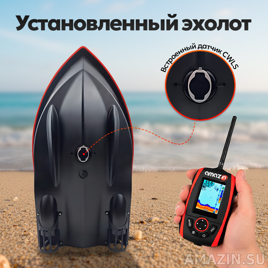 Простое и интуитивное управление: функция круиз-контроля активируется одним нажатием, а система позиционирования с возможностью записи до 2 GPS точек позволяет точно следовать заданному маршруту. Дальность дистанционного управления в идеальных условиях может достигать 500 метров, а встроенный гироскоп автоматически корректирует курс, обеспечивая идеальную точность движения. При этом установленный эхолот AMAZIN FF777-PRO-CWLS передает в реальном времени данные о глубине, рельефе дна и наличии рыбы, что помогает быстро определить оптимальное место для закорма. Мощный двигатель с двойными винтами и усиленным магнитом обеспечивает отличную динамику и высокую производительность при грузоподъемности до 1.5 кг.