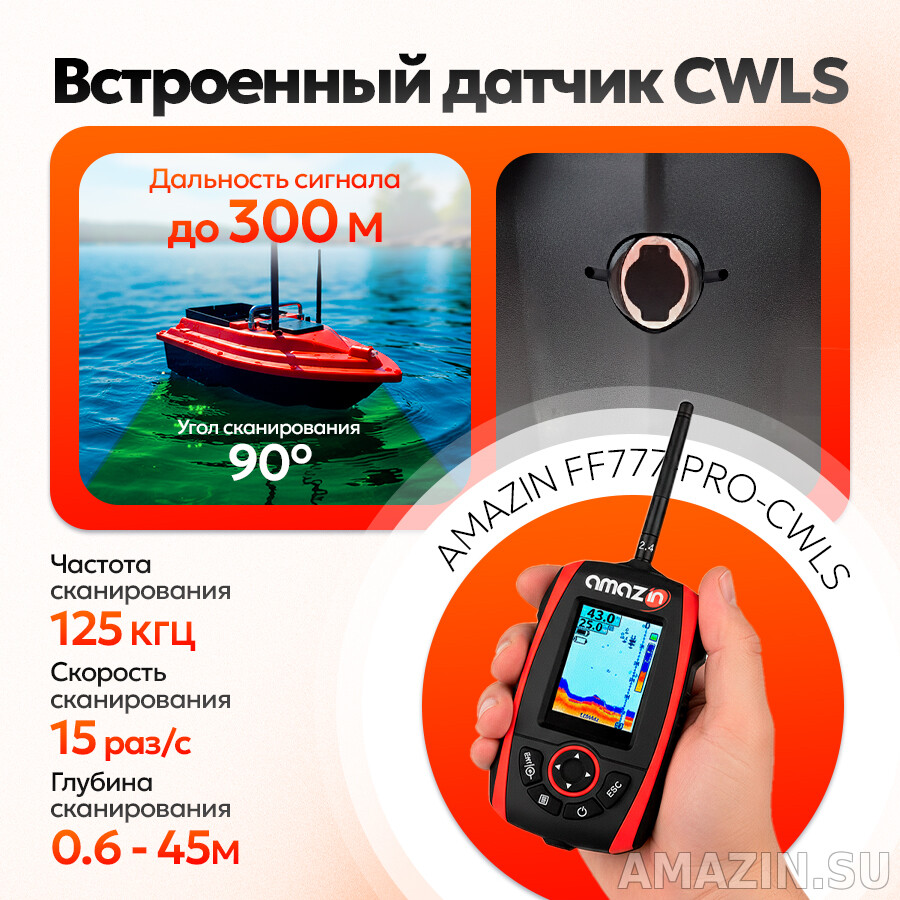 - Увеличенная дальность сигнала до 300 метров, благодаря усиленной внешней антенне и беспроводному датчику CWLS, встраиваемого в прикормочный кораблик любого ценового сегмента . Это подарит Вам новые перспективы и поможет отыскать рыбу даже на значительном расстоянии.