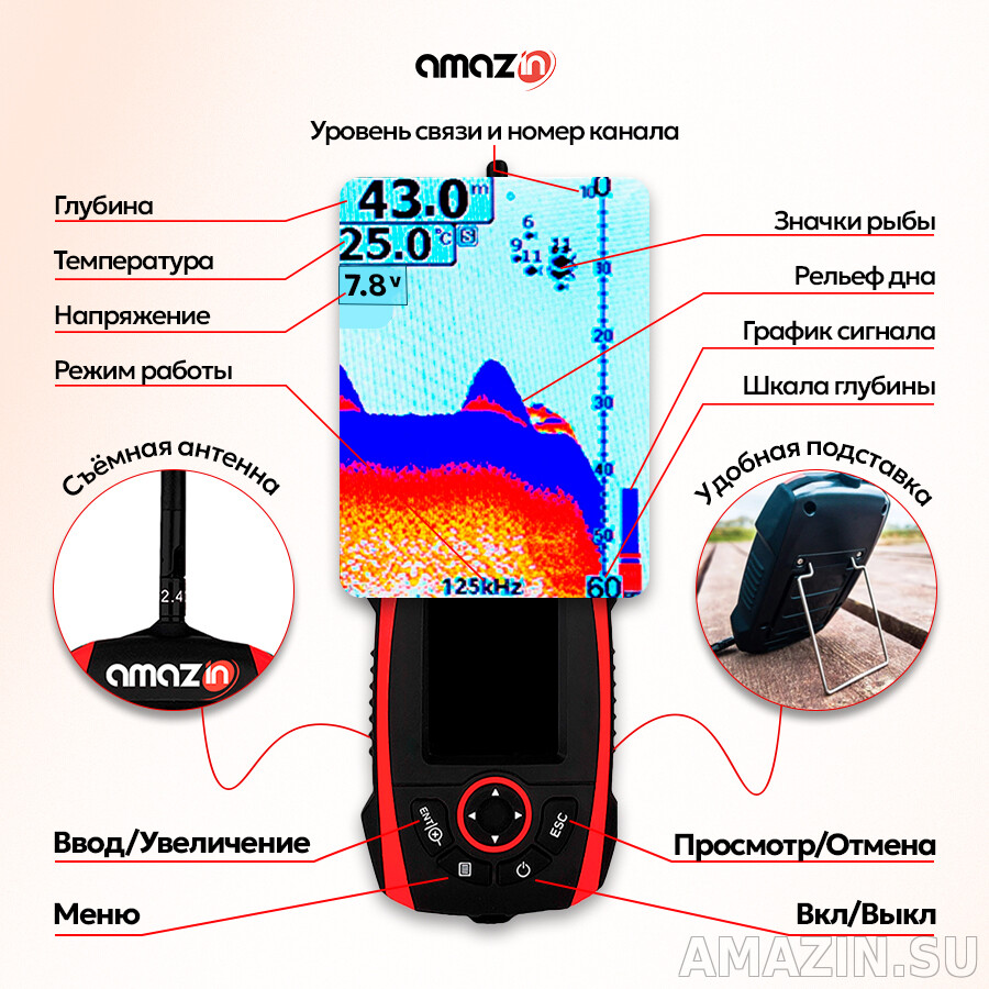 - Возможность подключения беспроводного датчика-шар для рыбалки с берега (покупается отдельно).