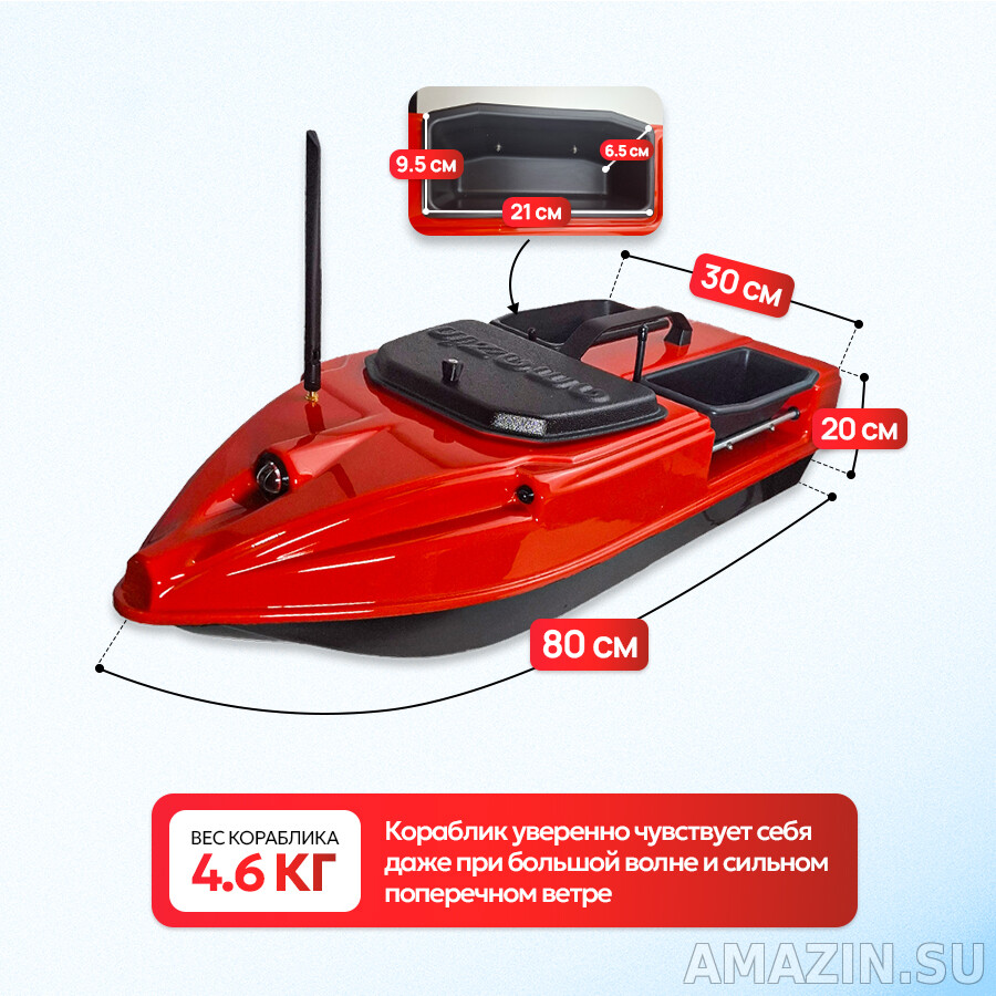 Переживать о дальности так же не стоит, передача сигнала от пульта до кораблика составляет 500 метров, в хороших погодный условиях благодаря профессиональной радиоаппаратуре с защитой от помех.