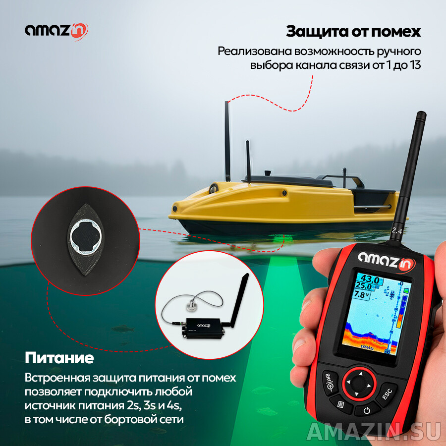 - Реализована возможность выбора каналов связи от 1 до 13. Возникают случаи, когда другие источники сигнала 2.4 ГГц, например прикормочные кораблики и другие эхолоты работающие на такой же частоте, мешают работе эхолота. Для предотвращения этого явления, в нашем эхолоте AMAZIN FF777-PRO-СWLS реализована возможность выбора каналов работы, что предотвращает интерференцию, а следовательно, возможное влияние на сигнал.