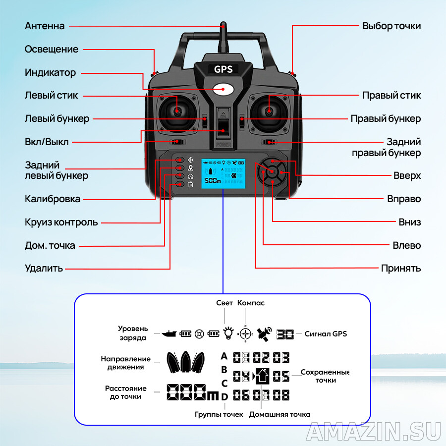 - GPS и навигация: возможность установки 4 рыболовных зон и 160 точек. Функция «круиз-контроль» позволяет кораблику двигаться по прямой с постоянной скоростью.