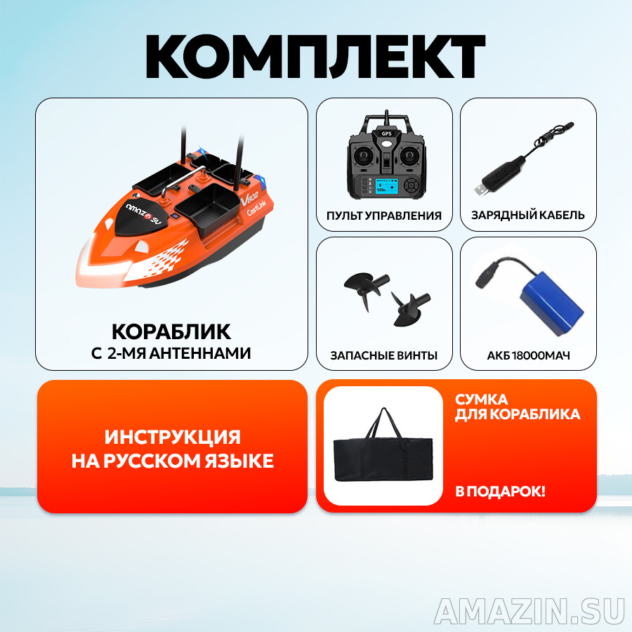 - Аккумулятор кораблика: 7.4В 18000 мАч