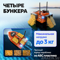 - 4 независимых бункера: раздельное управление четырьмя отсеками позволяет доставлять прикормку в разные места за один заплыв.