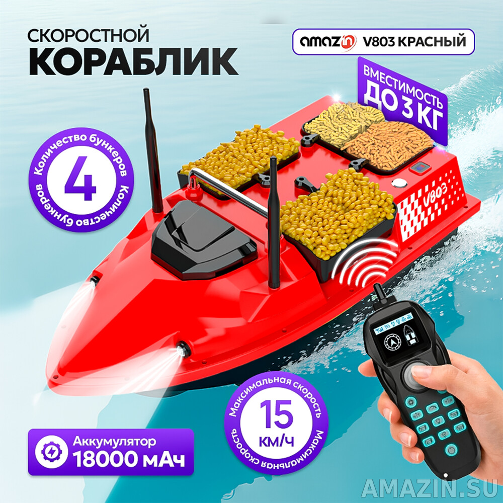 Закормочный кораблик для рыбалки V803 красного цвета - это профессиональный прикормочный кораблик нового поколения, созданный для максимально эффективной и точной рыбалки. Модель выделяется ярко-красным корпусом и уникальной системой из 4 независимых бункеров с общей грузоподъемностью до 3 кг.