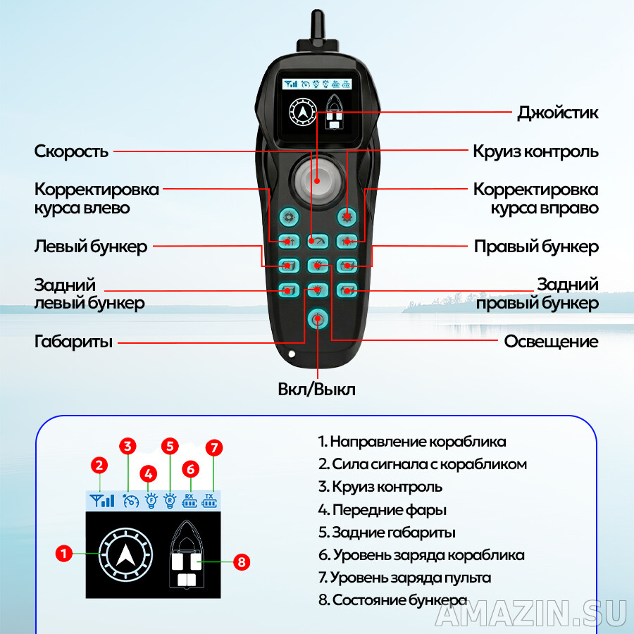 - Гироскоп: Автоматическая коррекция курса предотвращает рыскание и удерживает кораблик на прямой линии.