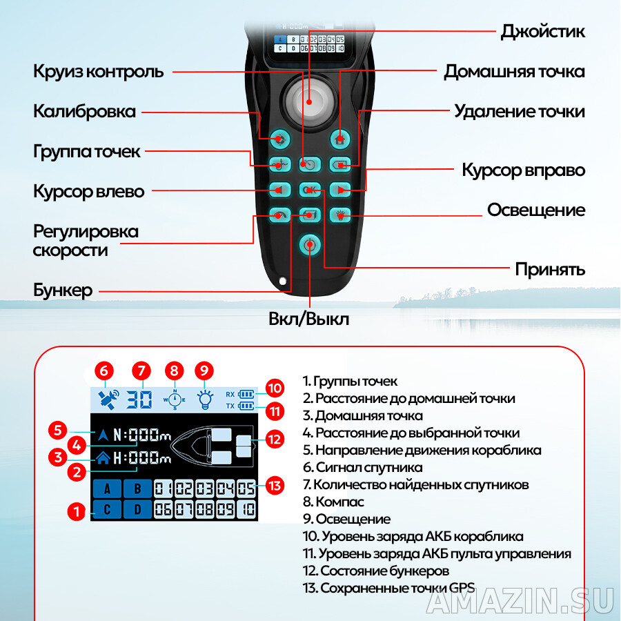 - Встроенный GPS: Память на 4 водоёма по 50 точек (всего 200). Кораблик перемещается между ними автоматически.