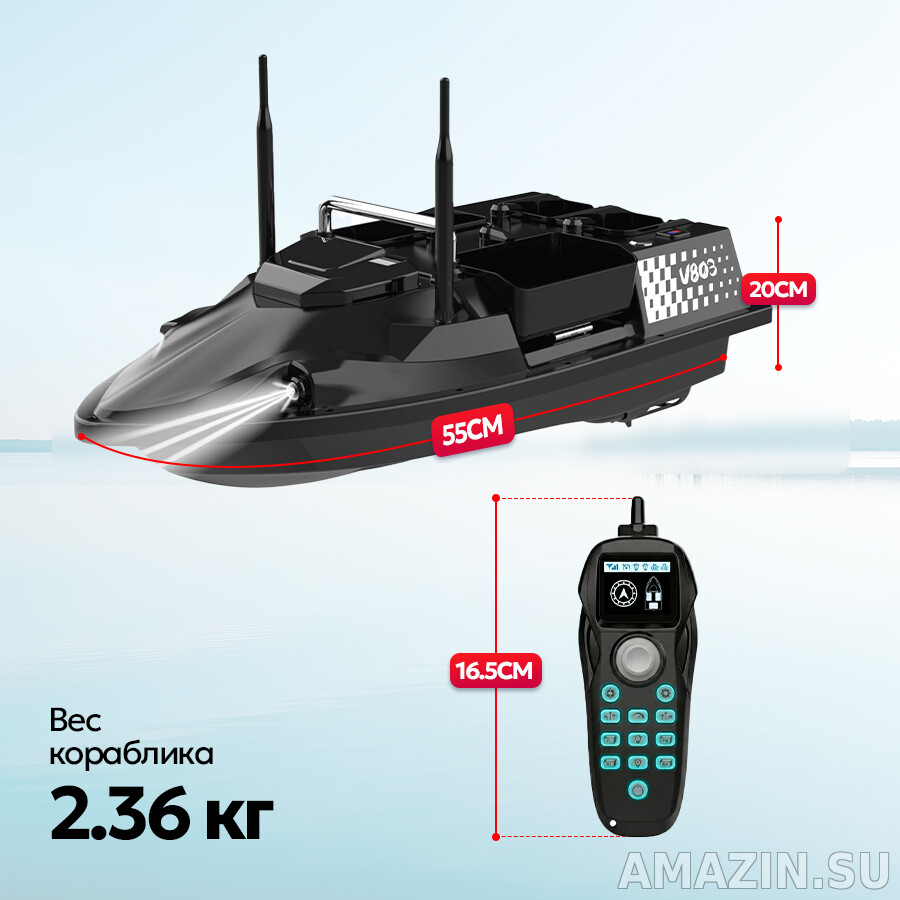 Кораблик выполнен в строгом черном цвете и предназначен для профессиональной карповой ловли. Он полностью берет на себя рутину по доставке корма: автопилот с высокой точностью приведет судно в нужную точку, произведет выгрузку и вернется на домашнюю точку. Система автоматического возврата при потере сигнала или низком заряде аккумулятора делает эксплуатацию максимально безопасной - вы никогда не потеряете свой корабль на середине водоема.